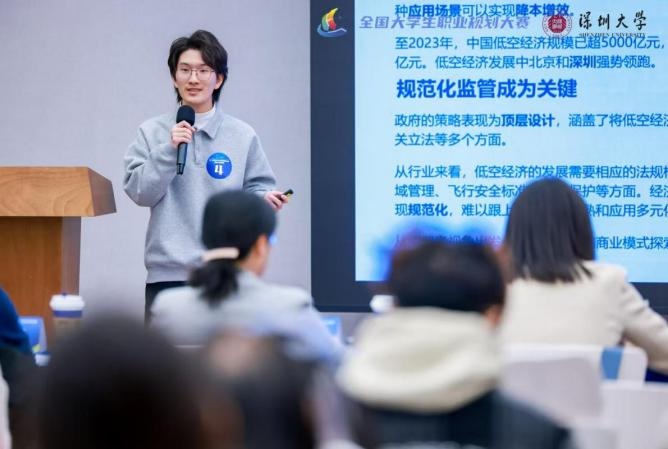 深圳大学校决赛展示包括7分钟自我主题陈述、4分钟综合面试及1分钟天降offer环节。在学院党委的领导和实验室的支持下,来自IEEE荣誉班的黄品添同学经过老师的全面指导和自身的充分准备,将自己的专业与社会需求相结合,阐述了自己对于低空经济未来前景的看法以及对于无人机规划算法工程师岗位的向往,并结合IEEE荣誉班“重国际素养,促科研热情,出优秀成果,成业界专家”的特色培养体系制定了一系列成长计划,赢得评委的一致认可,成为此次大赛唯一一位获金奖的大一学生。在赛场上展现出了良好的精神面貌,赛出了实验室学子的风采。