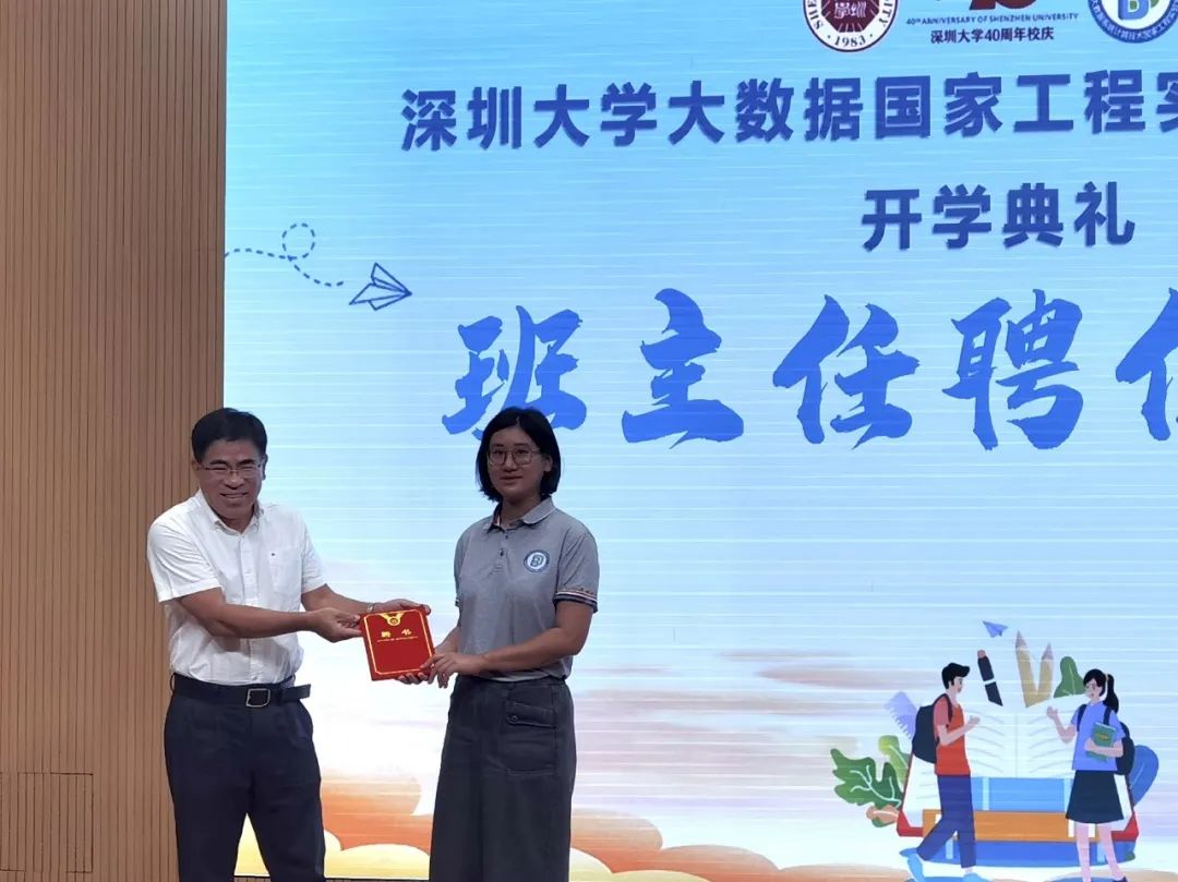在班主任聘用仪式上,陈新开院士和国家工程实验室副主任朱泽轩教授分别为张军和卓炜两位老师颁发聘书,他们将在接下来的学年中担任新生们的班主任。